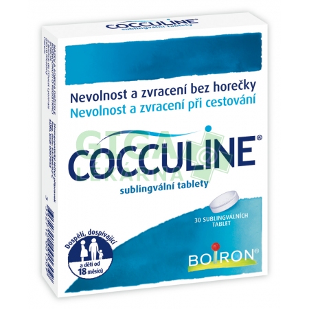 Počas zvracania je vždy nutné dopĺňať tekutiny, napr. popíjaním rehydratačného roztoku po malých dúškoch, aby sa kompenzovala náhla strata tekutín a minerálov z tela. Pred užitím COCCULINE sa poraďte so svojím lekárom alebo lekárnikom, ak máte ďalšie otázky týkajúce sa jeho použitia. Iné lieky a prípravok COCCULINE Neočakávajú sa žiadne interakcie s inými liekmi. Informujte svojho lekára alebo lekárnika o všetkých liekoch, ktoré užívate, ktoré ste nedávno užívali alebo ktoré možno budete užívať. Tehotenstvo, dojčenie a plodnosť Tento liek sa môže užívať počas tehotenstva a dojčenia a nemá žiadny vplyv na plodnosť. Ak ste tehotná alebo dojčíte, domnievate sa, že môžete byť tehotná alebo plánujete otehotnieť, poraďte sa so svojím lekárom alebo lekárnikom skôr, ako začnete tento liek užívať. Vedenie vozidla a obsluha strojov COCCULINE nemá žiadny vplyv na schopnosť viesť vozidlá alebo obsluhovať stroje a nespôsobuje ospalosť. COCCULINE obsahuje sacharózu a monohydrát laktózy. Ak Vám lekár povedal, že neznášate niektoré cukry, poraďte sa so svojím lekárom skôr, ako začnete tento liek užívať. 3. AKO UŽÍVAŤ COCCULINEVždy užívajte tento liek presne v súlade s písomnou informáciou pre používateľov alebo podľa pokynov svojho lekára alebo lekárnika. Ak si nie ste istý, poraďte sa so svojím lekárom alebo lekárnikom. Orálne podanie. Tablety užívajte najlepšie mimo jedla. Odporúčané dávkovanie prípravku je: 1. Prevencia a liečba nevoľnosti a vracania pri cestovaní Dospelí a mladiství od 12 rokov: Deň pred cestou: 2 tablety nechať rozpustiť v ústach 3x denne. V deň cesty: 2 tablety nechať rozpustiť v ústach 3x denne. Pri nástupe príznakov: 2 tablety nechať rozpustiť v ústach. V prípade potreby zopakovať. Deti od 18 mesiacov: Deň pred cestou: 1 tabletu nechať rozpustiť v ústach 3x denne. V deň cesty: 1 tabletu nechať rozpustiť v ústach 3x denne. Pri nástupe príznakov: 1 tabletu nechať rozpustiť v ústach. V prípade potreby zopakovať. Vzhľadom na možnosť vdýchnutia tablety u detí do 6 rokov rozpustite tabletu v malom množstve vody. Interval predlžujte v závislosti od zlepšenia. Akonáhle príznaky vymiznú, ukončite užívanie lieku. Ak sa nebudete cítiť lepšie alebo ak sa Vám priťaží, musíte sa poradiť s lekárom. 2. Liečba nevoľnosti (pocitu na zvracanie) a zvracanie bez horúčky Dospelí a mladiství od 12 rokov : Dve tablety nechať rozpustiť v ústach pri nástupe príznakov. V prípade potreby zopakovať. Deti od 18 mesiacov : Jednu tabletu nechať rozpustiť v ústach pri nástupe príznakov. V prípade potreby zopakovať. Vzhľadom na možnosť vdýchnutia tablety u detí do 6 rokov rozpustite tabletu v malom množstve vody. V prípade nevoľnosti a vracania bez horúčky majú deti vo veku 18 mesiacov až 6 rokov užívať tento liek len po porade s lekárom alebo lekárnikom. Interval predlžujte v závislosti od zlepšenia. Akonáhle príznaky vymiznú, ukončite užívanie lieku. Ak sa do 24 hodín nebudete cítiť lepšie alebo ak sa Vám priťaží, musíte sa poradiť s lekárom. Ak užijete viac COCCULINE ako ste mali Neočakáva sa žiadne riziko, ak ste užili viac COCCULINE ako ste mali. Ak zabudnete užiť COCCULINE Nezdvojnásobujte nasledujúcu dávku, aby ste nahradili vynechanú dávku. Ak máte ďalšie otázky týkajúce sa použitia tohto lieku, opýtajte sa svojho lekára alebo lekárnika. 4. MOŽNÉ VEDĽAJŠIE ÚČINKY Podobne ako všetky lieky môže mať aj tento liek nežiaduce účinky, ktoré sa ale nemusia vyskytnúť u každého. Neočakávajú sa žiadne nežiaduce účinky. Hlásenie nežiaducich účinkov Ak sa u vás vyskytne akýkoľvek vedľajší účinok, obráťte sa na svojho lekára alebo lekárnika. Rovnako postupujte v prípade akýchkoľvek nežiaducich účinkov, ktoré nie sú uvedené v tejto písomnej informácii pre používateľov. Nežiaduce účinky môžete hlásiť aj priamo na adresu: Štátny ústav pre kontrolu liečiv Šrobárova 48 100 41 Praha 10 Webové stránky: www.sukl.cz/nahlasit-nezadouci-ucinek Nahlásením nežiaducich účinkov môžete prispieť k získaniu viac informácií o bezpečnosti tohto lieku. 5. AKO UCHOVÁVAŤ COCCULINE Tento liek nevyžaduje žiadne zvláštne podmienky uchovávania. Uchovávajte tento liek mimo dohľadu a dosahu detí. Neužívajte tento liek po dátume exspirácie uvedenom na škatuľke a blistri EXP. Čas použiteľnosti sa vzťahuje na posledný deň uvedeného mesiaca. Nevyhadzujte žiadne lieky do odpadových vôd alebo domáceho odpadu. Spýtajte sa svojho lekárnika, ako naložiť s prípravkami, ktoré už nepoužívate. Tieto opatrenia pomáhajú chrániť životné prostredie. 6. OBSAH BALENIA A ĎALŠIE INFORMÁCIE Čo COCCULINE obsahuje Liečivá v jednej sublingválnej tablete (150 mg) sú: Anamirta cocculus (Cocculus indicus) 4 CH...................................0,375 mg Strychnos nux-vomica (Nux vomica) 4 CH......................................0,375 mg Nicotiana tabacum (Tabacum) 4 CH................................................0,375 mg Petroleum rectificatum 4 CH.............................................................0,375 mg Ďalšie zložky sú : sacharóza, monohydrát laktózy, magnéziumstearát. Ako vyzerá COCCULINE a obsah balenia Biele hladké okrúhle bikonvexné tablety, PVC/Al blister, krabička. Balenie obsahuje 30 sublingválnych tabliet. Držiteľ rozhodnutia o registrácii a výrobca BOIRON, 2 avenue de l'Ouest Lyonnais, 69510 Messimy, Francúzsko Ďalšie informácie o tomto lieku získate u miestneho zástupcu držiteľa povolenia na uvedenie na trh: BOIRON CZ, sro, Pobrežná 3/620, 186 00 Praha 8, tel.: 224835090, e-mail: info@boiron.cz. Skratky uvedené na balení: Lot = číslo šarže, EXP = použiteľné do. |