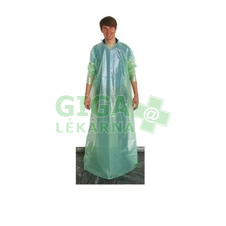 Jednorazová plastová zástera na ochranu odevu pred znečistením.