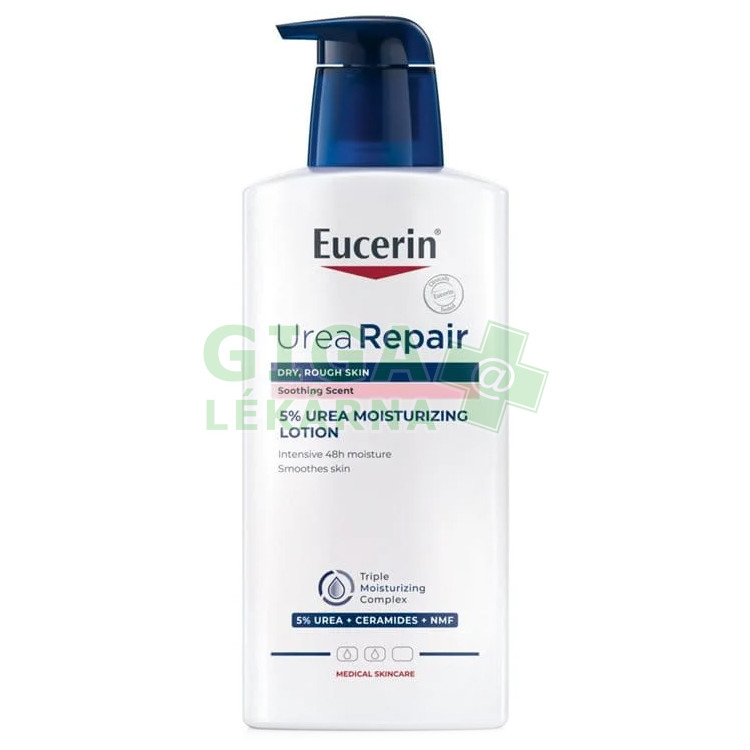 Telové mlieko pre suchú pokožku je vhodné pre dospelých , pre osoby so zrelou pokožkou a taktiež je vhodné pre pokožku diabetikov a pre deti od troch rokov. Tiež ho možno použiť ako doplnkovú starostlivosť. Klinické a dermatologické štúdie preukázali v elmi dobrú účinnosť a kožnú znášanlivosť na suchej pokožke. Parfumované zloženie je klinicky testované, aby nedráždilo pokožku alebo nespôsobilo začervenanie. V hodnej pre starostlivosť pokožku diabetikov; tiež ako doplnková starostlivosť. Ako telové mlieko účinkuje?Hlavnou účinnou zložkou je urea: „zlatý štandard“ v starostlivosti o suchú pokožku. Urea je zvlhčujúca zložka (priťahuje do pokožky vodu), zvyšuje schopnosť pokožky vodu v sebe viazať a pomáha udržovať jej bariérovú funkciu. Tým zlepšuje pružnosť pokožky a chráni ju proti strate hydratácie (známej tiež ako transepidermálna strata vody). Eucerin UreaRepair PLUS komplex kombinuje ureu s ceramidmi, gluko-glycerolom a ďalšími prirodzenými hydratačnými látkami, ktoré podporujú účinnosť urey. Ceramidy identické s tými, ktoré sa v pokožke vyskytujú prirodzene, vytvárajú ochranný lipidový obal chrániaci vonkajšie vrstvy pokožky a posilňujúci jej bariérovú funkciu, zatiaľ čo gluko-glycerol zlepšuje distribúciu vody v hlbších epidermálnych vrstvách, čím hydratuje pokožku zvnútra. Táto kombinácia hydratačných zložiek a zložiek, ktoré dopĺňajú chýbajúce lipidy, poskytuje suchej pokožke vynikajúcu podporu. Máte suchú pokožku pri ochorení cukrovkou?Eucerin UreaRepair PLUS Telové mlieko 5% Urea s jemnou parfumáciou je vhodné aj na starostlivosť o pokožku diabetikov. Tiež ako doplnková starostlivosť. Čo je urea? Urea (známa tiež ako karbamid) je pokožkou prirodzene produkovaná a je jednou z nevyhnutných prirodzených hydratačných látok (NMFs - Natural Moisturizing Factors), ktoré regulujú množstvo vlhkosti v pokožke. Urea je hygroskopická, čo znamená, že má schopnosť viazať vodu vo vonkajších vrstvách pokožky. Je tiež keratolytická, inými slovami pomáha pokožke zbavovať sa odumretých kožných buniek a získať tak späť svoju hladkosť, pôsobí proti svrbeniu a má antimikrobiálne vlastnosti. Vďaka tomu všetkému zlepšuje prirodzenú exfoliáciu pokožky a upokojuje a vyhladzuje jej povrch. Urea ako prirodzene produkovaná látka je pokožkou, a to aj suchou a citlivou, dobre znášaná. Vzhľadom na všetky tieto účinky a veľmi dobré výsledky zo štúdií sa urea stala zlatým štandardom v starostlivosti o suchú pokožku.* Prirodzené hydratačné faktory (NMFs - Natural Moisturizing Factors)Zdravá pokožka obsahuje prirodzené hydratačné faktory, ktoré viažu vodu v horných vrstvách pokožky a pomáhajú tak predchádzať jej vysychaniu, šupinateniu a hrubnutiu. Medzi prirodzené hydratačné látky v pokožke patria napríklad aminokyseliny, neorganické soli, laktát a urea. Rad UreaRepair PLUS zodpovedá prirodzenej skladbe prirodzených hydratačných faktorov v zdravej pokožke a poskytuje suchej pokožke látky, ktoré potrebuje pre svoju optimálnu hydratáciu. Hlavné vlastnosti EUCERIN UreaRepair telové mlieko 5 %