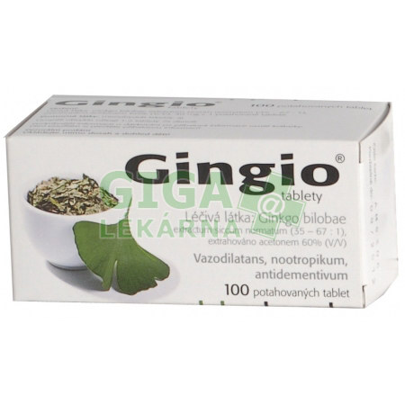 Upozornenie a opatreniaPred užitím lieku Gingio sa poraďte so svojím lekárom alebo lekárnikom. Pri chorobne zosilnenom sklone ku krvácaniu (krvácavé stavy) a pri súčasnej liečbe liekmi ovplyvňujúcimi krvnú zrážanlivosť (ako je napr. warfarín alebo dabigatran), sa tento liek smie používať iba po porade s lekárom. Iné lieky a prípravok Gingio Informujte svojho lekára alebo lekárnika o všetkých liekoch, ktoré užívate, ktoré ste nedávno užívali alebo ktoré možno budete užívať. Účinky lieku Gingio a účinky iných súbežne užívaných liekov sa môžu vzájomne ovplyvňovať. Tehotenstvo, dojčenie a plodnosť Ak ste tehotná alebo dojčíte, domnievate sa, že môžete byť tehotná alebo plánujete otehotnieť, poraďte sa so svojím lekárom alebo lekárnikom skôr, ako začnete tento liek užívať. Vedenie vozidla a obsluha strojovOvplyvnenie schopnosti viesť vozidlá a obsluhovať stroje nie sú známe. Liek Gingio obsahuje monohydrát laktózy a tekutú glukózu usušenú rozprášením. Ak Vám Váš lekár povedal, že neznášate niektoré cukry, poraďte sa s ním, než začnete tento liečivý 3. Ako sa liek Gingio užíva Vždy užívajte tento liek presne v súlade s písomnou informáciou pre používateľov alebo podľa pokynov svojho lekára alebo lekárnika. Ak si nie ste istý, poraďte sa so svojím lekárom alebo lekárnikom. Dospelí a starší pacienti užívajú dve filmom obalené tablety trikrát denne. Dávka sa má rozdeliť rovnomerne, napr. ráno, na obed a večer. Neužívajte viac ako 6 tabliet denne, čo zodpovedá 240 mg čisteného a kvantifikovaného suchého ginko extraktu. Ak užijete viac Gingio, ako mátePríznaky predávkovania nie sú známe. Pri predávkovaní alebo náhodnom požití lieku dieťaťom sa poraďte s lekárom. Ak zabudnete užiť GingioNezdvojnásobujte nasledujúcu dávku, aby ste nahradili vynechanú dávku, ale pokračujte v ďalšom dávkovaní tak, ako Vám to odporučil Váš lekár alebo ako to je uvedené v písomnej informácii. 4. Možné nežiaduce účinkyPodobne ako všetky lieky môže mať aj tento liek nežiaduce účinky, ktoré sa ale nemusia vyskytnúť u každého. Hodnotenie výskytu nežiaducich účinkov vychádza z tejto klasifikácie ich frekvencie: