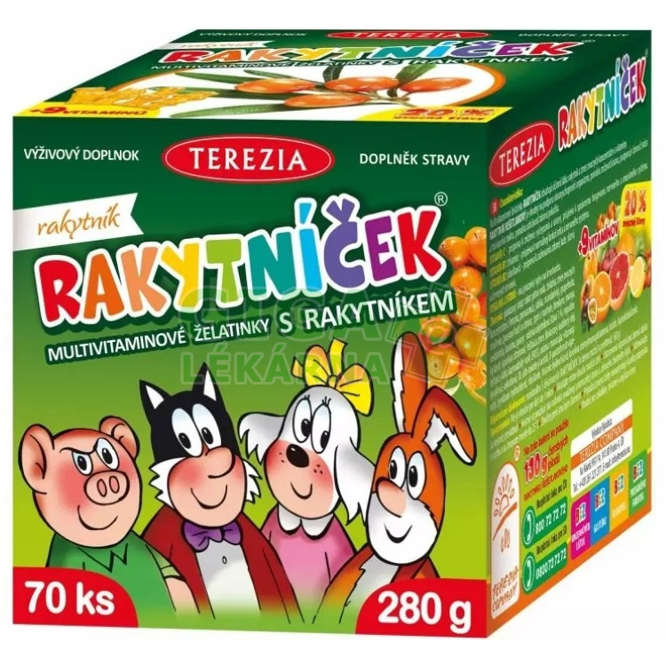 | Upozornění: | Přípravek RAKYTNÍČEK želatínky ORIGINÁL 70ks je registrovaný jako doplněk stravy. Nemá schválené léčivé účinky a nejedná se o lék. Doplňky stravy nejsou určeny jako náhrada pestré stravy. Nepřekračujte doporučené dávkování. |