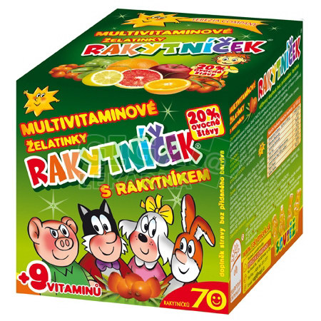 RAKYTNÍČEK želatínky ORIGINÁL - doplnok stravy. Výrobok RAKYTNÍČEK želatinky a jeho účinky nie sú založené na obsahu vitamínov, ale na obsahu rakytníka, ktorý je hlavnou zložkou výrobku vrátane ovocnej šťavy. Rakytník je prirodzene bohatým zdrojom vitamínov a biologicky aktívnych látok a nemá stanovenú dennú odporúčanú dávku. Odporúčame 3-5 želatínok denne. S certifikátom o zdravotnej bezpečnosti SZÚ Praha. Bez konzervačných látok. Bez lepku. Bez sladidiel. Bez pridaných farbív. Účinné látky