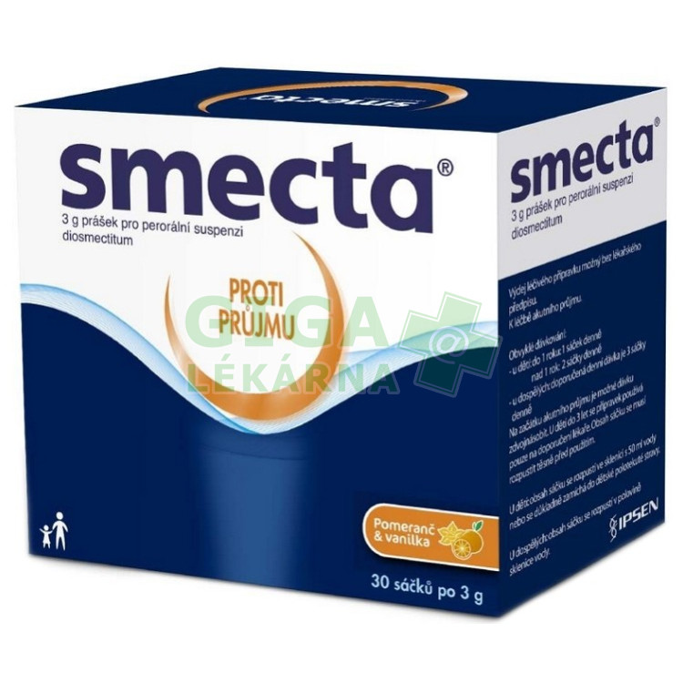 Upozornenie a opatrenia Pred užitím lieku SMECTA sa poraďte so svojím lekárom alebo lekárnikom: Opatrnosť je potrebná pri použití lieku u pacientov, ktorí v minulosti trpeli závažnou chronickou zápchou. Ak trpíte akútnou hnačkou sprevádzanou prítomnosťou krvi v stolici alebo vysokou teplotou, nezačnite liečbu týmto liekom a ihneď vyhľadajte lekára. Ak príznaky pretrvávajú dlhšie ako 2 dni, prestaňte liek užívať a poraďte sa s lekárom. Lekára vyhľadajte vždy pri hnačke malých detí vo veku do 3 rokov. Liečba akútnej hnačky u detí má byť spojená s včasným podaním dostatočného množstva tekutín na zabránenie dehydratácie (=strata tekutín). Na doplnenie tekutín do organizmu u detí sa používa perorálny rehydratačný roztok. U dospelých liečba vo všeobecnosti vyžaduje rehydratáciu (=doplnenie tekutín do organizmu), a to najmä pri závažnom priebehu ťažkostí. Množstvo podaných tekutín a spôsob ich podania je nutné prispôsobiť veku a stavu pacienta a závažnosti hnačky. Deti a dospievajúci Iné lieky a liek SMECTA Keďže absorpčné vlastnosti tohto lieku môžu ovplyvniť mieru alebo stupeň vstrebávania iných liekov, neodporúča sa podávať iné lieky v rovnakom čase ako liek SMECTA. SMECTA s jedlom a nápojmi Tehotenstvo a dojčenie Vedenie vozidla a obsluha strojov SMECTA obsahuje glukózu a sacharózu (je súčasťou vanilkovej a pomarančovej arómy). 3. Ako sa liek SMECTA užíva Vždy užívajte tento liek presne v súlade s písomnou informáciou pre používateľov alebo podľa pokynov svojho lekára. Ak si nie ste istý, poraďte sa so svojím lekárom alebo lekárnikom. Pokiaľ lekár neurčí inak, odporúčané dávkovanie je nasledujúce: Liečba akútnej hnačky:
